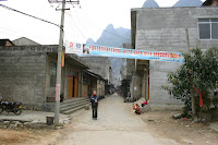 Selgub et oleme siiski suhteliselt õiges kohas, nimelt Xingpingi linna lähedal. Päris õige koht see vist siiski ka polnud, sest sellest loeme hiljem ka oma raamatust, et väikesed paadiomanikud ei sõida päris linnani, et hoida kokku mingisugusest maksust. Jõematk kestis kokku paar tundi ja selle ajaga läbisime umbes 25 km pikkuse lõigu. Suvisel ajal saab väidetavalt sõita Guilinist alates ca 80 km lõigu. Mopeedi kärus saame tunda, mis tunne on ilmselt porganditel ja kapsastel, kui neid aiakärus mööda auklikku munakivi teed veetakse. Eksootikat ei pea õnneks kaua kannatama (Alice lisab, et tema jaoks oli see ääretult lõbus sõit) ning varsti olemegi bussijaamas, kus juba kassiir meid bussi peale hõikab. Uljalt sammudes teatame soovist Guilini saada. Selgub, et siit linnast Guilini ei saa, ega pole ka kunagi saanud. Parim võimalus on sõita veel 20 - 30 km lõuna poole Yangshuo linna ja sealt otsida tagasisõidu võimalusi. Nii ka teeme. Pilet 6 RMB.