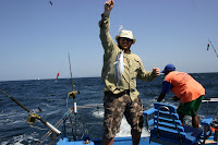 Kostab vile! Keegi ei saa aru, mida tegema peab. Laev peatub, junga võtab kätte ühe ridva ning annab käsu kellelgi laeva taga keskel asuvasse tooli istuda. Chehthets istub pukki, ritv pannakse talle jalge vahele ning kangutamine võib alata. Liigutused on sellised, et kohe saame kätte suure vaala. Natuke kerimist ning veest ilmub nähtavale uim. Selge, see on hoopis hai. Kui junga anna käsu kerimine lõpetada ning sikutab tamiili pidi veest välja kalakese, osutub see ilmselt tuunikalaks. Kaalu oma paar kilo. Meie tunneme kalu ju samahästi nagu laevameeskond inglise keelt, seega jääb kala tuunaks, kuna kõik osapooled on nõus ja noogutavad. Junga ei ole endiselt ühtegi heli kuuldavale toonud, seletab ainult kätega, seega nendime, et tegemist on ilmselt tummaga (see jääbki lõpuni saladuseks). Järjekordse kehakeelse vestluse tulemusena saame teada, et kohe läheb sügavamaks ning siis peaks ka kala rohkem tulema. Lained tundub, et lähevad aina suuremaks. Markol on õnnestunud valida koht laeva vasakus servas, kust vahest mõni suurem laine ka üle parda lööb nii et riided märjad. Kops tahab vägisi üle maksa hüpata. Alice ja Kerli enesetunne kisub üsna sandiks ning nad võtavad sisse horisontaalasendi teisel tekil asuval madratsil. Mehed lepivad kokku järjekorra, kes millal pukki istub, juhul kui on vaja kangutama hakata. Siis äkki leiab aset mitu sündmust korraga. Suurem tuuleiil viib Maidul peast nokamütsi, mis kaob kiirelt lainetesse. Hetke pärast kostub järjekordne vile, sest üks ritvadest on lookas. Seekord istub pukki Marko ja jäljendab hetk tagasi suurelt kalamehelt õpitud liigutusi. Tunne on tugev. Raskelt tuleb ja just kui siputaks kõvasti. Peast käib läbi mõte, et oleks see vaid suurem, kui eelmine. Enne veel kui jõuame ise näha, kui suur see saak seekord ka on, asub junga naerma (tagantjärgi enam ei mäletagi, kas see oli tummnaer, aga naer igaljuhul). Junga sikutab tamiili veest välja ja viimase konksu otsas on Maidu nokamüts. ??? Seega konto seis: Janek 1 kala, Marko 1 nokamüts, teistel seni suur null. Sellel teemal pikemalt ei peatuks, niigi piinlik, kuid samas kala oskab igaüks kinnipüüda, aga katsuge te avamerelt nokamütse püüda.