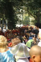 tohutu saksa- ja jaapanituristide mass, kõik peenelt riides, suured turismibussid teeääres ootamas. Tardume paigale. Kuhu me küll sattunud oleme! Kust need turistid siia said!? Momentaalselt tunneme, et oleme vales kohas. Suundume siiski edasi, kuhu Shushu meid juhatas. Leiame eest hiigelsuured potid, mis on täis riisi. Osad mungad on köögitoimkonnas ning segavad riisipotis suurte nuiadega. Varsti hakkavad rivis saabuma ka mungad, paljajalu, igal-ühel oma toidupott (kaanega kausike) kaasas. Riisipoti juurde jõudes, tõstetakse neile siis kulbitäis riisi. Samuti eraldavad