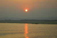 siis otsustame veel edasi sõita. Istume algul üsna rahulikult ja vaatame laevalt maha astuvaid turiste. Mingi hetk märkame, et laev on peaaegu tühi. Ja lõpuks ongi meid, turiste, laevas 3. Meie ja üks blond tüdruk. Mis toimub? Loeme oma raamatut igaks-juhuks. Old Baganist Nyaung U'sse on ca 4-5km, mida taksoga peaks läbima 5 min. Hobutaksoga ilmselt 15 min. Palju laevaga aega läheb? Ca 30 min, teatab laevapoiss. Selge siis. Kavalad turistid tahavad kiiremini kohale jõuda. Kuna meie jaoks on juba hilja laevalt lahkumiseks, siis lepime oma saatusega. Naudime päikeseloojangut ja mõlgutame mõtet tänane öö palmi all veeta. Kardame, et just see juhtub, kui see tohutu turistidemass enne meid kohale jõuab. Lohutame ennast, et saame vähemalt neist kauem nautida laevalt avanevat vaadet kaldal paistvatele punaketele templitele. Templitippude rohkus paneb südame kohe kiiremini põksuma. Ei jõua kohe homset päeva ära oodata.